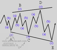 An ending diagonal is a special type of pattern that occurs at times when the preceding move has gone too far too fast, as Elliott put it. A very small percentage of ending diagonals appear in the C wave position of A-B- C formations. In double or triple threes, they appear only as the final "C" wave. In all cases, they are found at the termination points of larger patterns, indicating exhaustion of the larger movement.