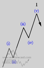 Waves 1, 2, 3, 4 and 5 together complete a larger impulsive sequence, labeled wave (1). The impulsive structure of wave (1) tells us that the movement at the next larger degree of trend is also upward. It also warns us to expect a three-wave correction — in this case, a downtrend. That correction, wave (2), is followed by waves (3), (4) and (5) to complete an impulsive sequence of the next larger degree, labeled as wave 1. At that point, again, a three-wave correction of the same degree occurs, labeled as wave 2.