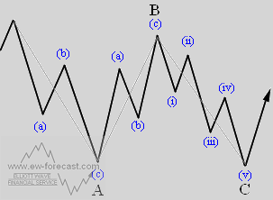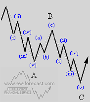 A zig-zag is a 3-wave structure labeled A-B-C, generally moving counter to the larger trend. It is one of the most common corrective Elliott patterns.